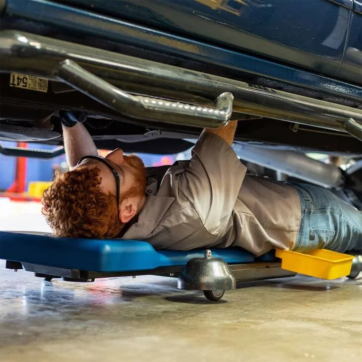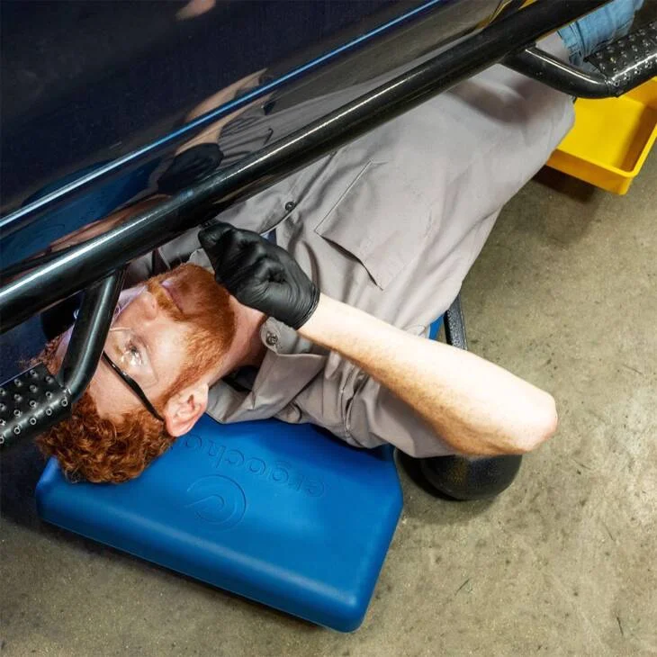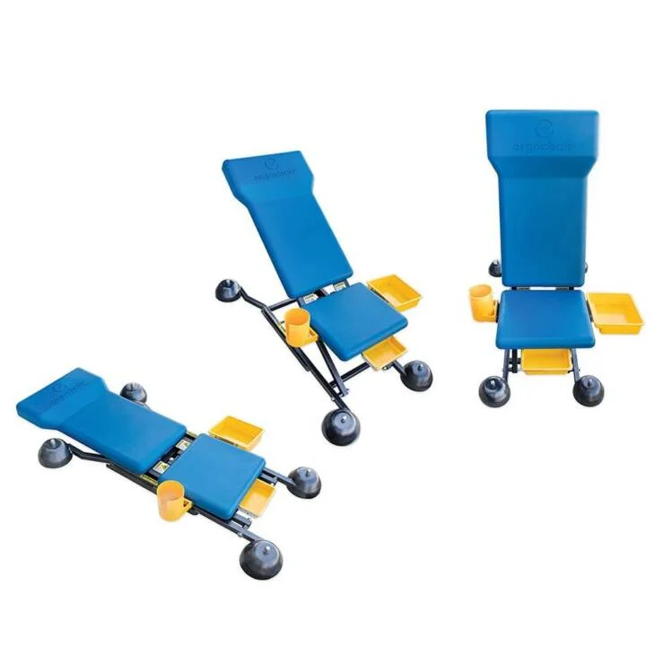 The Ergo-RS adjustable-height rolling work seat makes performing awkward work tasks ergonomically easier and safer for those who need to lie down, bend or contort their body to perform repetitious work duties, especially car and airplane mechanics, heavy-equipment technicians and factory and assembly line workers. The Ergo-RS works both as a chair and creeper featuring four swivel caster wheels that ensure stability and a full range of mobility. The Ergo-RS can move smoothly in all positions whether raised, reclined or lowered greatly relieving the stress on your back and other parts of your body while working.